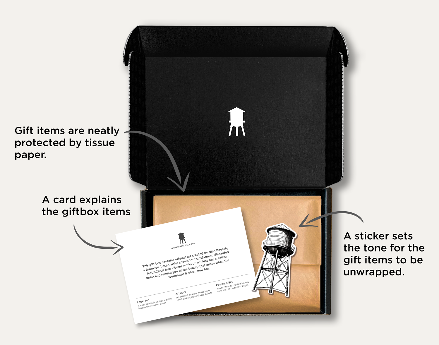 Your friends have enough artisanal soaps and scented candles. Give them this gift box filled with awesome NYC art instead! Everything inside the box is made and designed by Brooklyn based artist Nina Boesch. Scroll down to see what’s included in each giftbox!